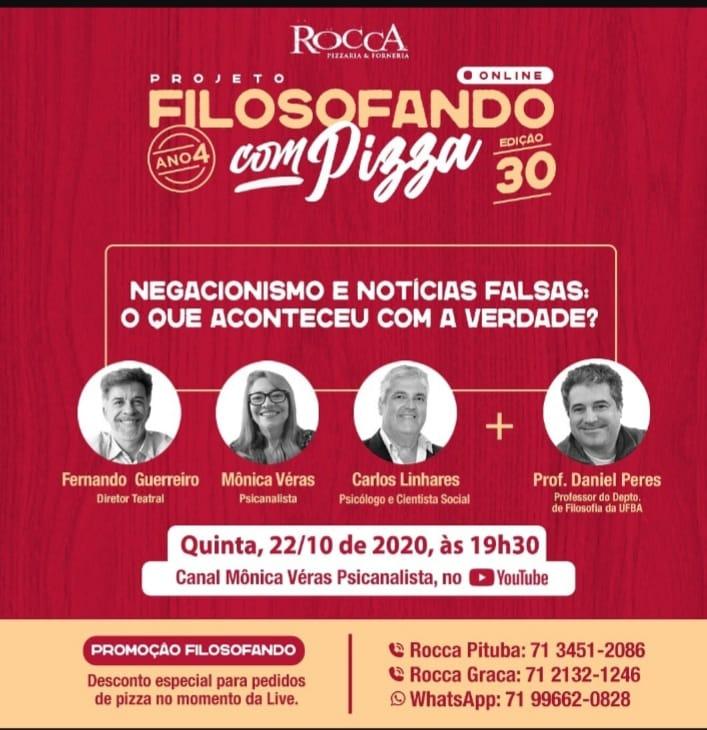 O "Filosofando com Pizza" desta quinta-feira (22) tratará das Fake News, contará com dois professores da UFBA, o Prof. Daniel Peres e o Prof. Linhares, além da Dra. Mônica Véras, psicanalista.