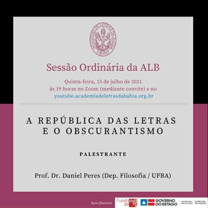 O Prof. Daniel Tourinho Peres palestrará na Sessão Ordinária da Academia de Letras da Bahia, falando sobre " A República das Letras e o Obscurantismo", no dia 15 de julho, às 19h, no Canal: youtube.academiadeletrasdabahia.org.br .