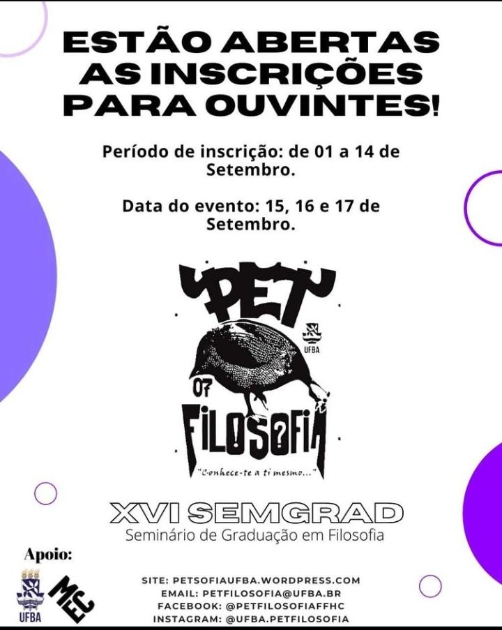 O SEMGRAD acontecerá nos dias 15, 16 e 17 de setembro. As inscrições para ouvintes estão abertas até 14/09 pelo link: https://forms.gle/5vPRxqxBZXsh4V4u6 ou pela bio do Instagram @ufba.petfilosofia .